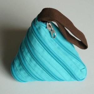 Sac à main en zip grosse maille en forme de Berlingot bleu turquoise avec dragonne chocolat.